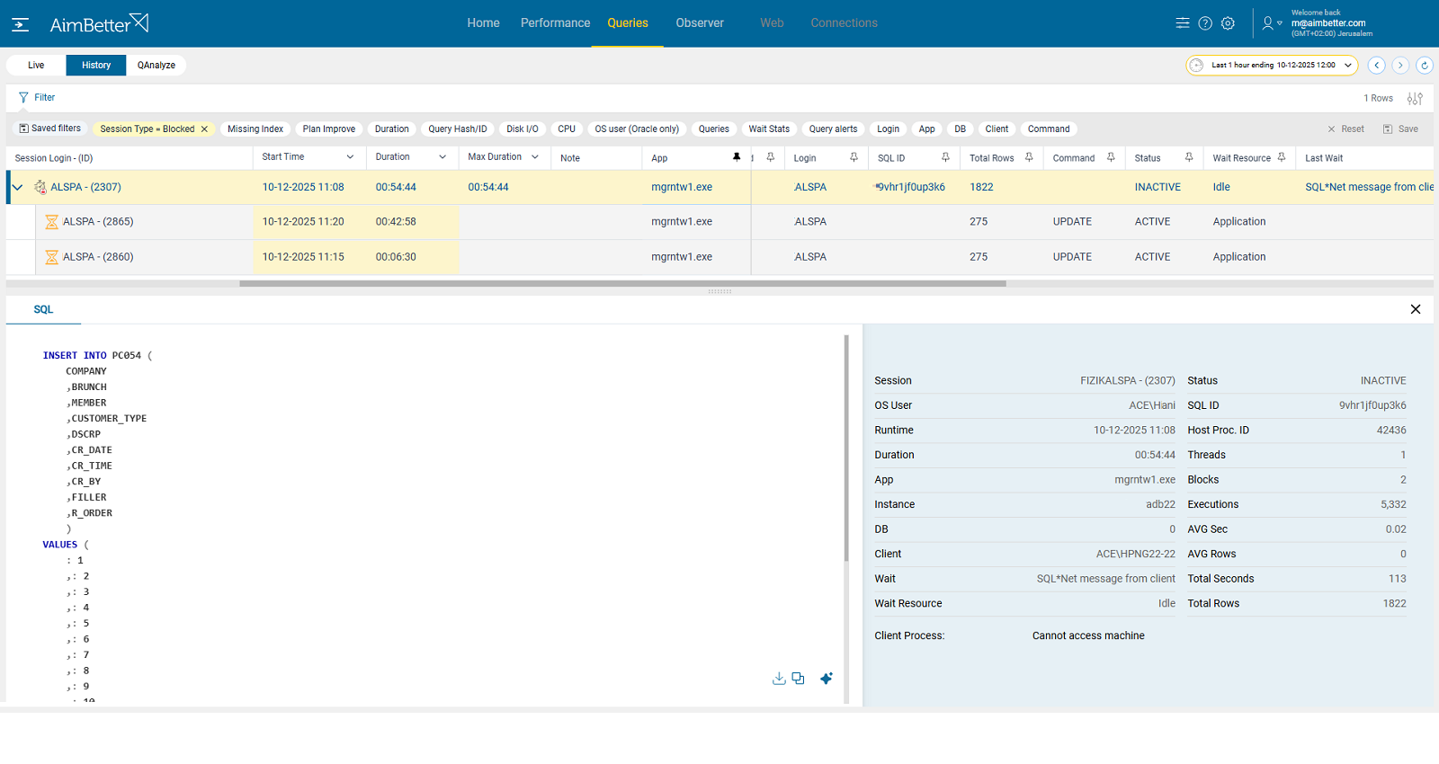 AimBetter makes it easy to identify the source of redo spikes by showing blocking and waiting sessions in real time and correlating them with the exact timestamps of log switch peaks. You can filter by session type (blocking) and queries’ code (INSERT, UPDATE, DELETE, MERGE, etc.) to quickly reveal which sessions and SQL were stuck and caused the surge.