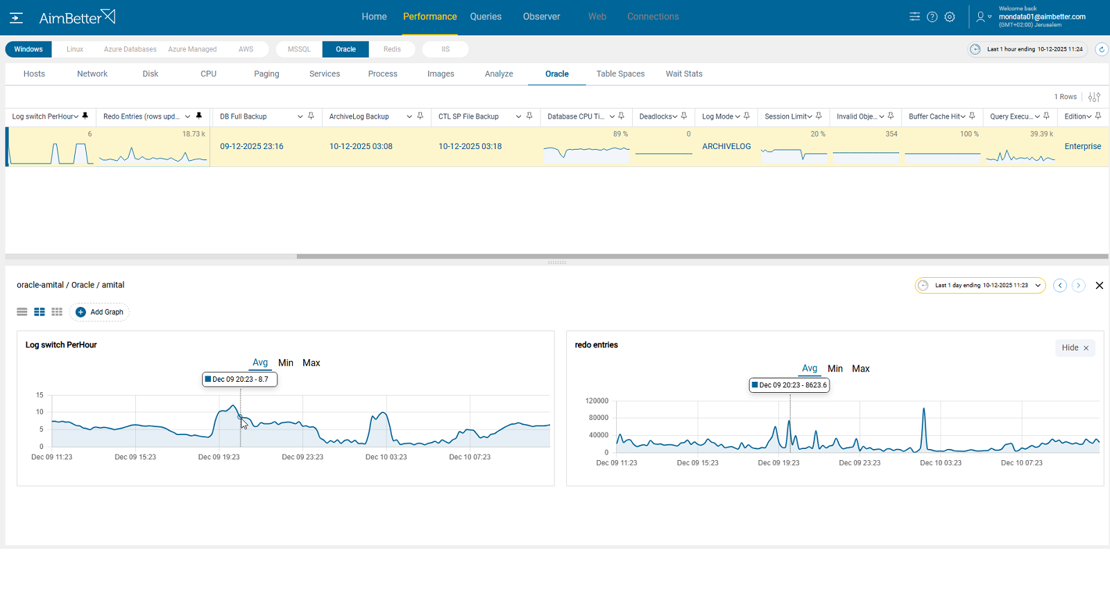 AimBetter does more than just count log switches per hour — it also tracks redo entries generated across time.