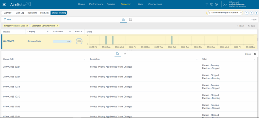 If the main Priority service or any other essential component goes down, AimBetter immediately triggers an alert. This proactive detection is vital for maintaining business continuity — especially for services that manage database access, user sessions, printing, or task scheduling. Instead of discovering issues after user complaints or system disruption, AimBetter ensures you know the moment a Priority service fails.