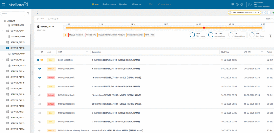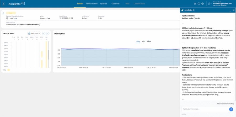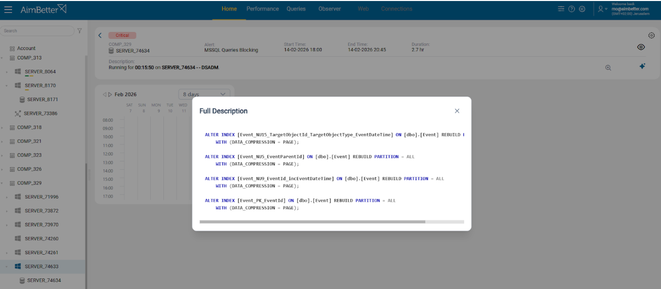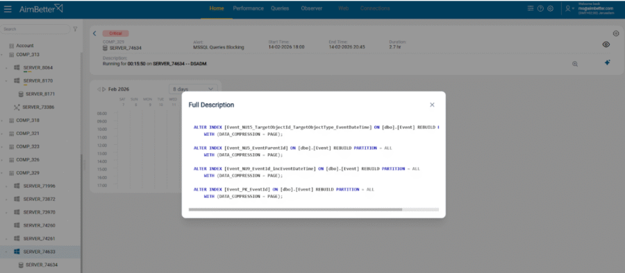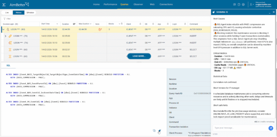 AimBetter AI delivers advanced analysis within the query details view, providing a clear explanation of the query’s behavior and expert-level recommendations based on execution context, server configuration, and performance data. It is like having a senior DBA reviewing every problematic query in real time.