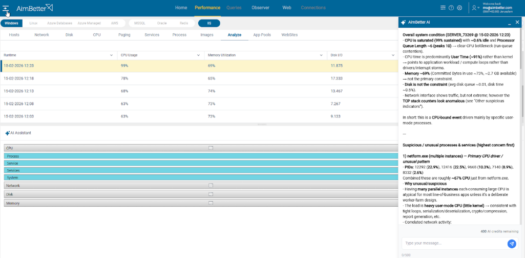 On the Performance Analyze tab for Windows OS hosts, AI evaluates the most resource-intensive