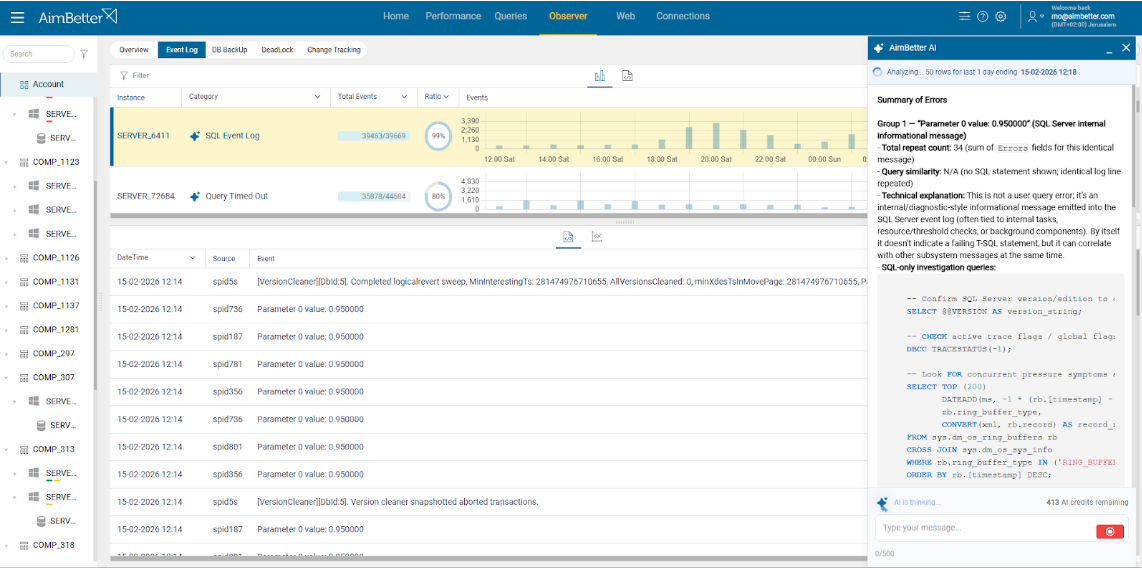 AI assistance is also available for individual event logs, providing a concise explanation of the event and guidance for resolving the issue. This makes complex system messages understandable even for team members who are not database experts.