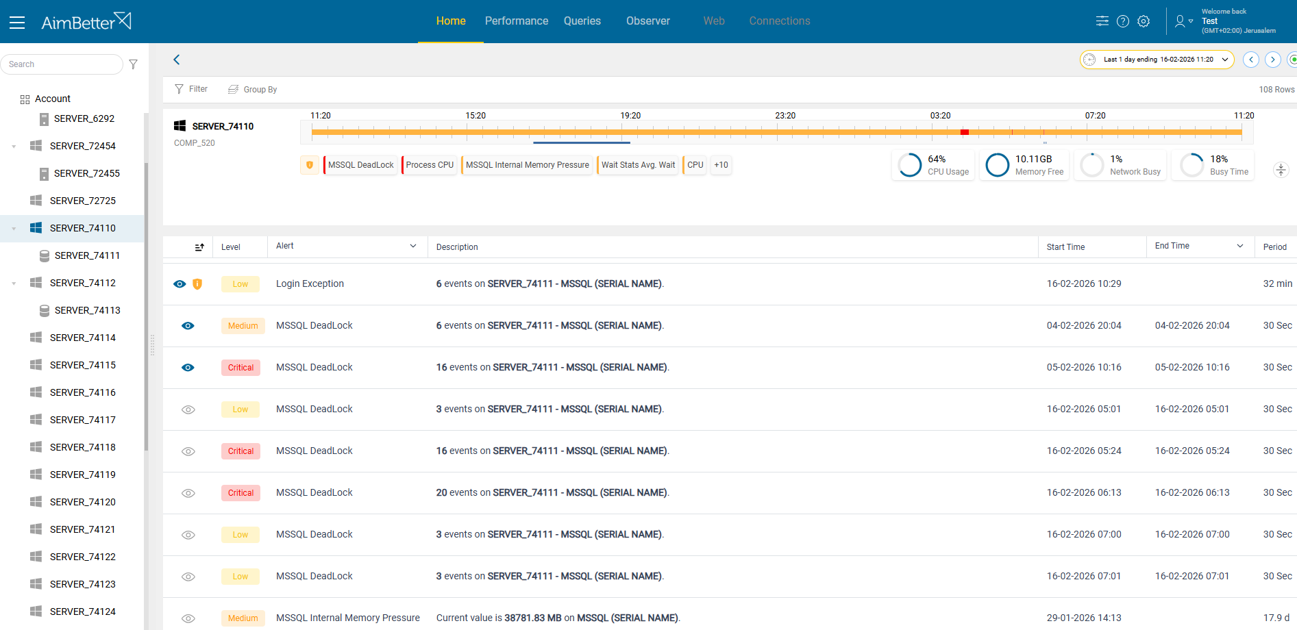 When troubleshooting critical disk, CPU, or query issues across your environment, you can instantly narrow your view to the relevant active alerts across all servers.
