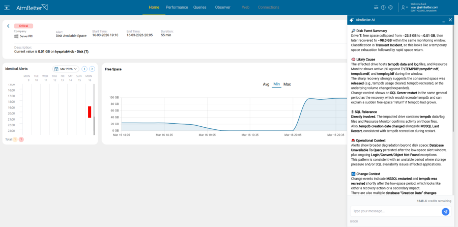 The AimBetter AI analysis confirmed that Disk T experienced a transient capacity event, with free space dropping from ~23.5 GB to near zero before recovering after a SQL Server restart. The cause was identified as TempDB growth, with active I/O on tempdb files during the window, and the restart recreated TempDB, releasing space. The AI recommended reviewing TempDB usage patterns, autogrowth settings, and related SQL operations to prevent similar incidents.