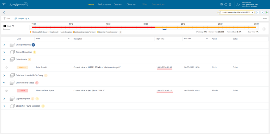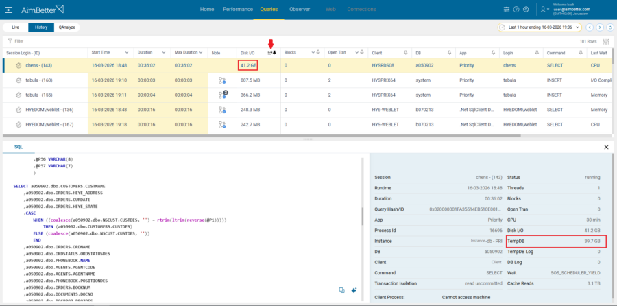 Using AimBetter’s deep monitoring capabilities, Jake drilled down into the SQL Server activity, focusing on high Disk I/O and TempDB usage.