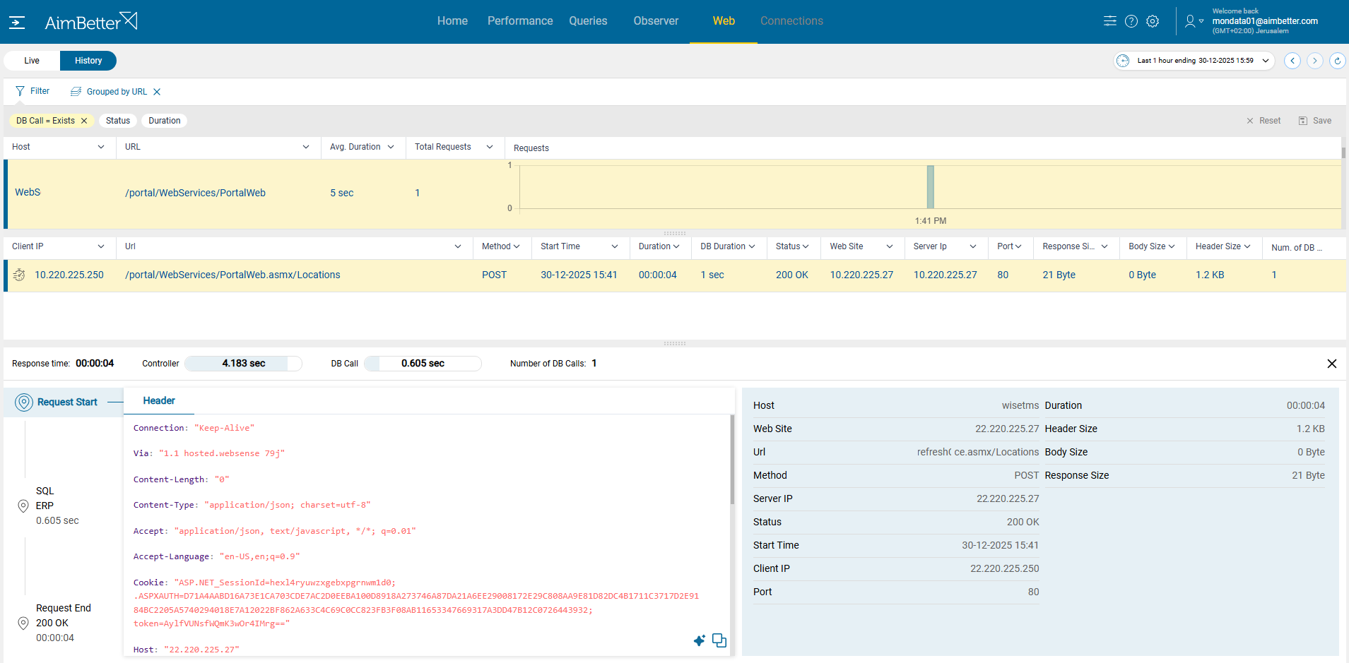 ✓ Request flow details, including header, body, and DB Calls code and each step duration